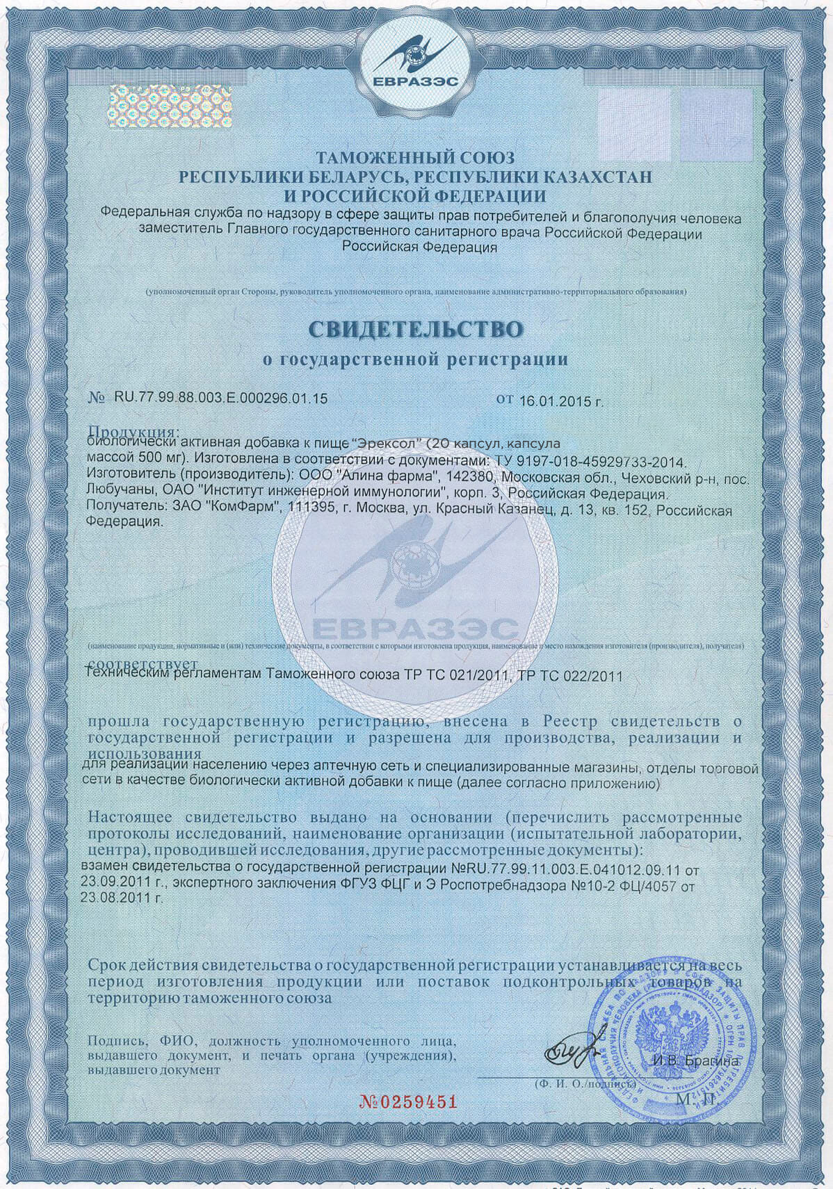 Чтобы понять, разводом или правдой является информация о препарате Эрексол, стоит изучить документы, представленные на сайте. Из них становится понятно, что до получения разрешения на продажу препарат прошел клинические испытания и получил сертификат, подтверждающий положительный эффект от его применения.